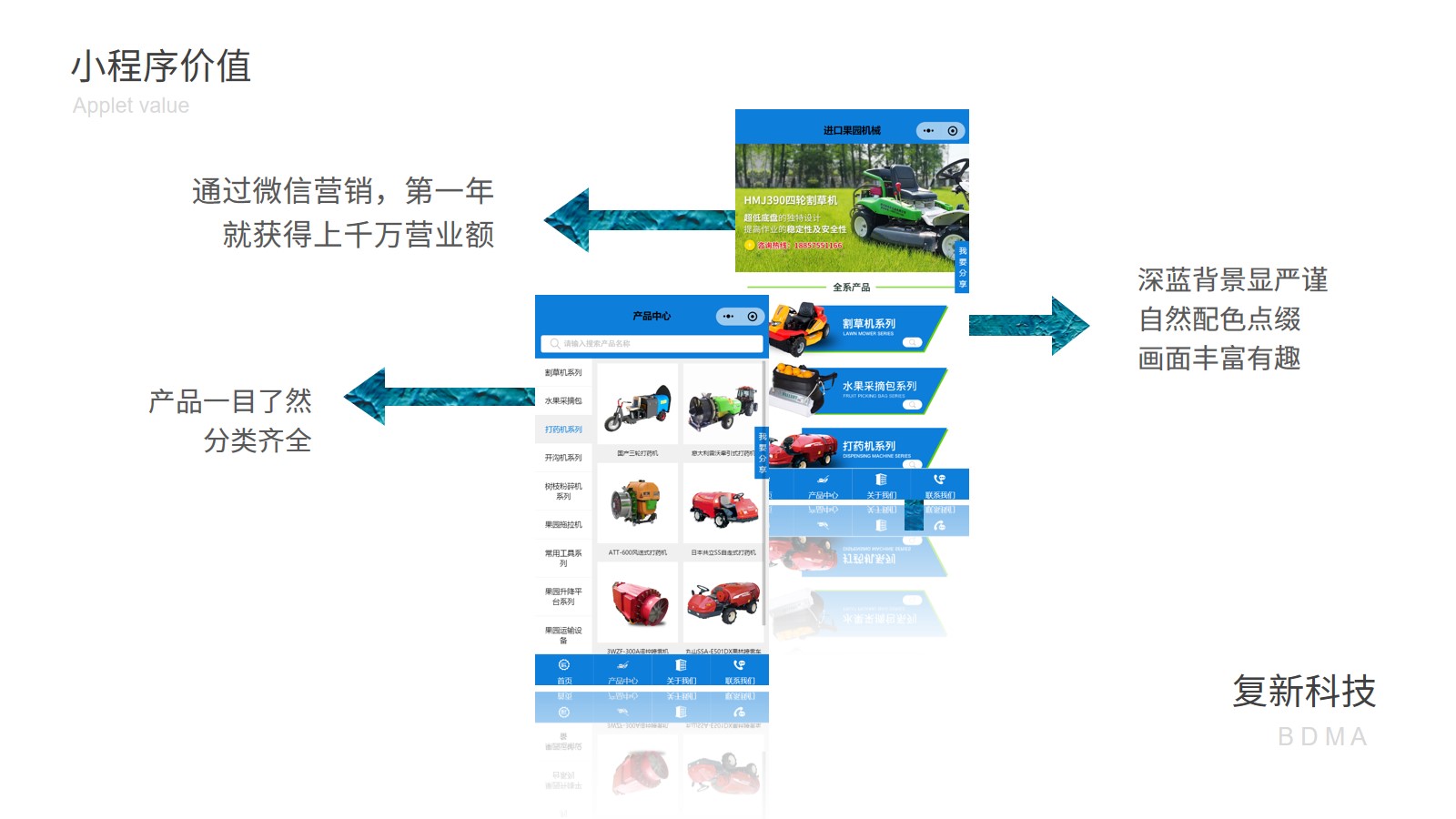 进口果园机械小程序案例 案例背景 客户主要想要两个效果: 1、产品展示效果要好; 2、小程序界面要严谨但不能枯燥 案例详情 深蓝背景显严谨,自然配色点缀令画面丰富有趣; 产品一目了然,分类齐全; 客户通过该微信小程序营销,第一年就从中获得上千万营业额。 成果展示 该微信小程序,在第一年就帮助客户获得上Service