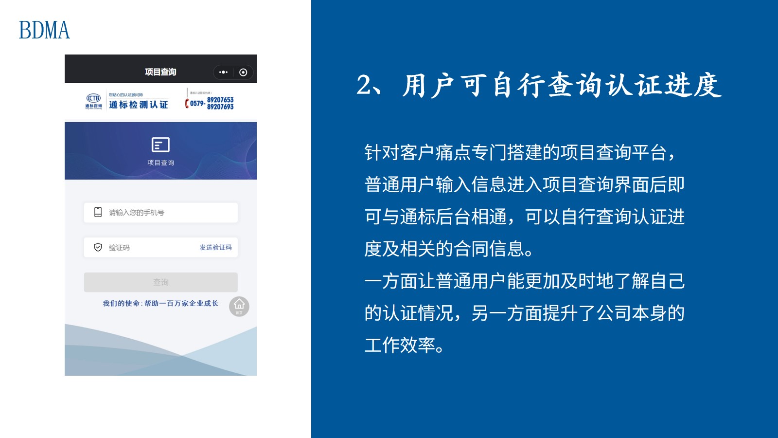 针对客户痛点专门搭建的项目查询平台,普通用户输入信息进入项目查询界面后即可与通标后台相通,可以自行查询认证进度及相关的合同信息。